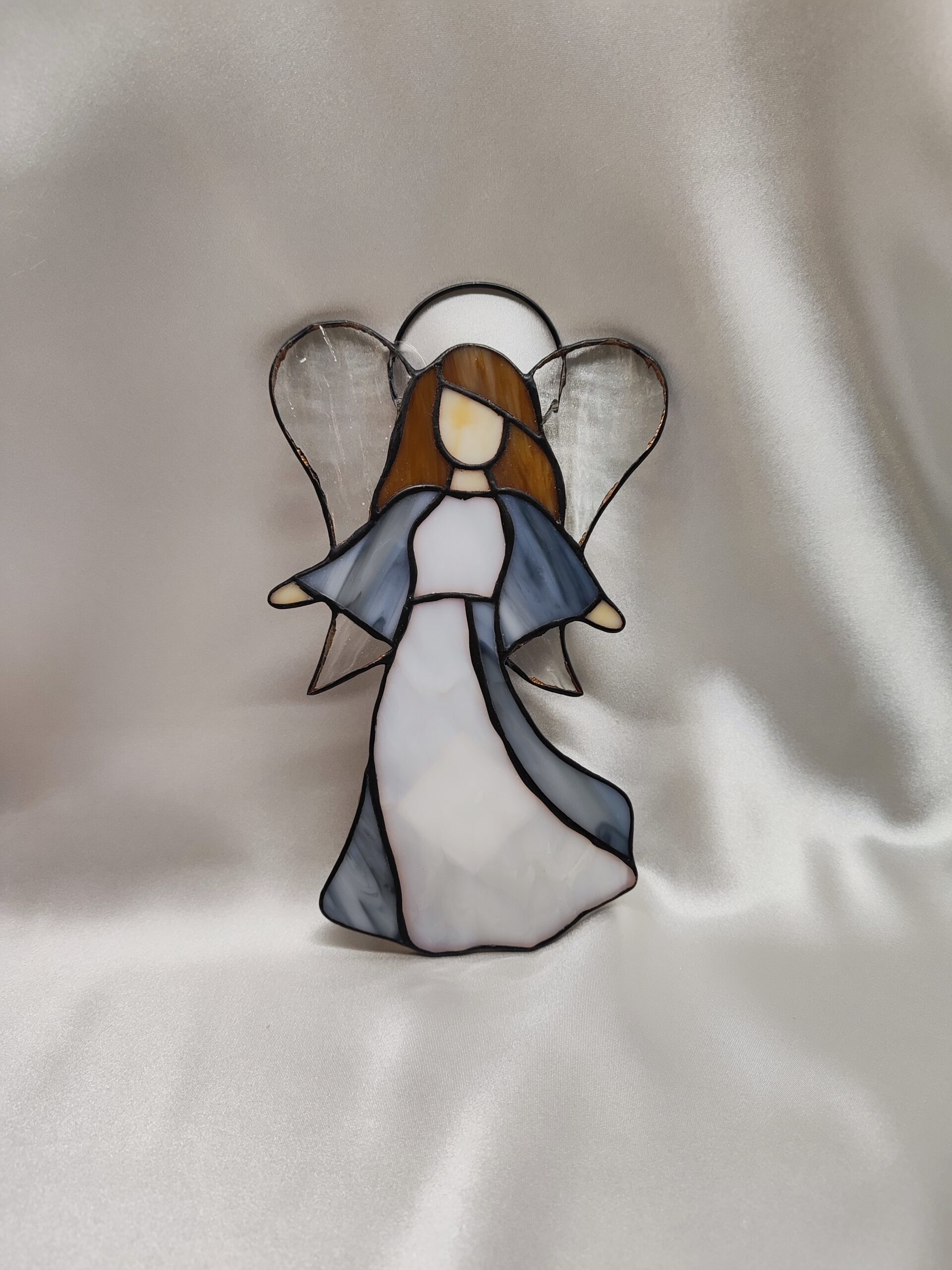 Ten ręcznie wykonany anioł witrażowy o wymiarach 19 cm na 11cm to wyjątkowa dekoracja, która wniesie do Twojego wnętrza spokój, ciepło i odrobinę świątecznej magii. Subtelna sylwetka anioła, utrzymana w odcieniach bieli, , przyciąga wzrok swoim eleganckim, minimalistycznym stylem. Jego białe szaty pięknie współgrają z błękitną narzutką, a skrzydła nadają całości lekkości i eterycznego uroku. Charakterystyczna, prosta forma twarzy sprawia, że dekoracja staje się uniwersalna i harmonijna – pasuje zarówno do wystroju klasycznego, jak i nowoczesnego. Anioł świetnie prezentuje się zawieszony w oknie, gdzie światło podkreśla jego kolory, ale może być również piękną ozdobą ściany czy świątecznej aranżacji. Każdy produkt wykonujemy na indywidualne zlecenie i dokładamy wszelkich starań aby był najwyższej jakości, dlatego też czas realizacji to około 21 dni. Po złożeniu zamówienia informujemy dokładnie o czasie realizacji.