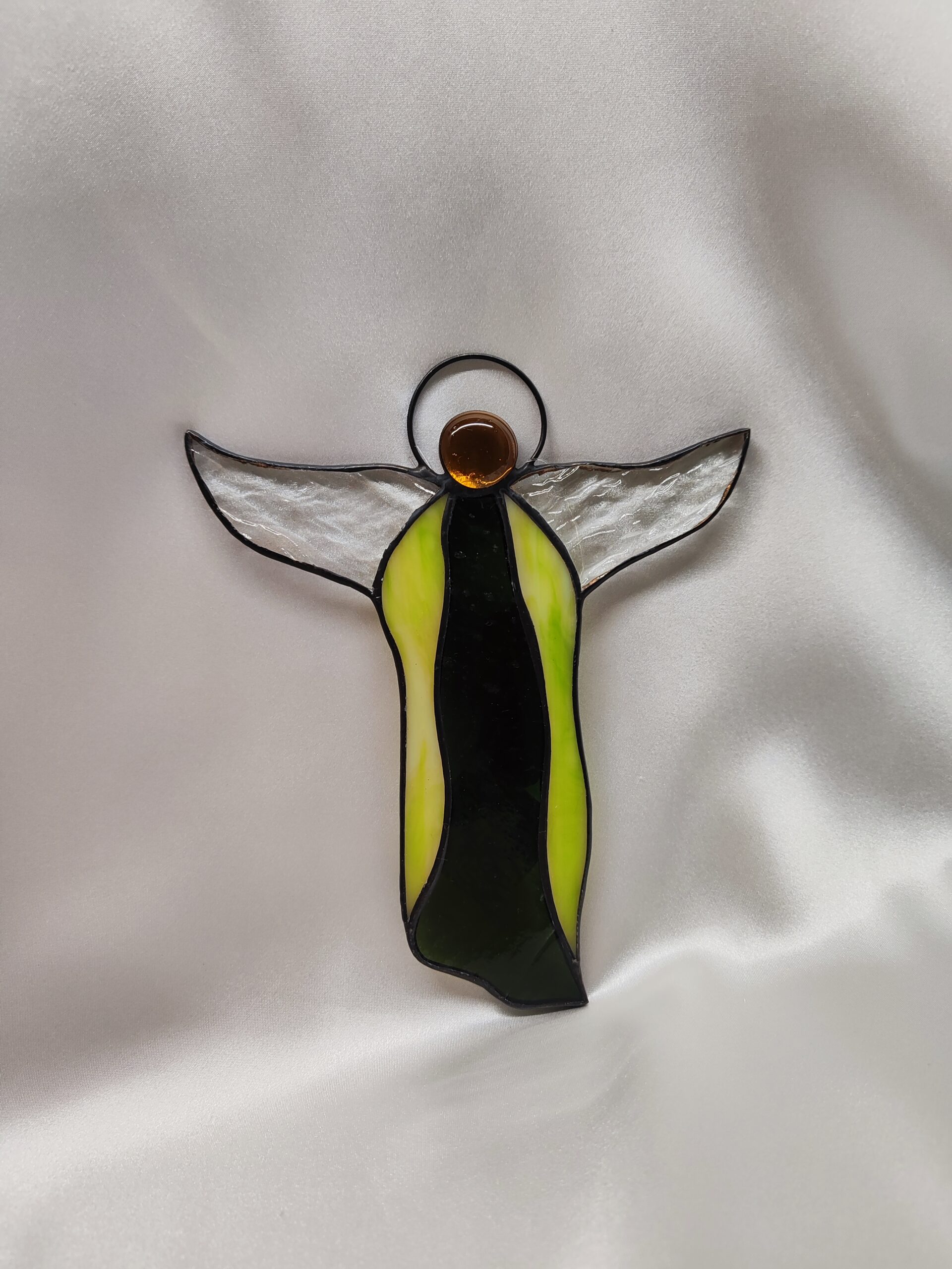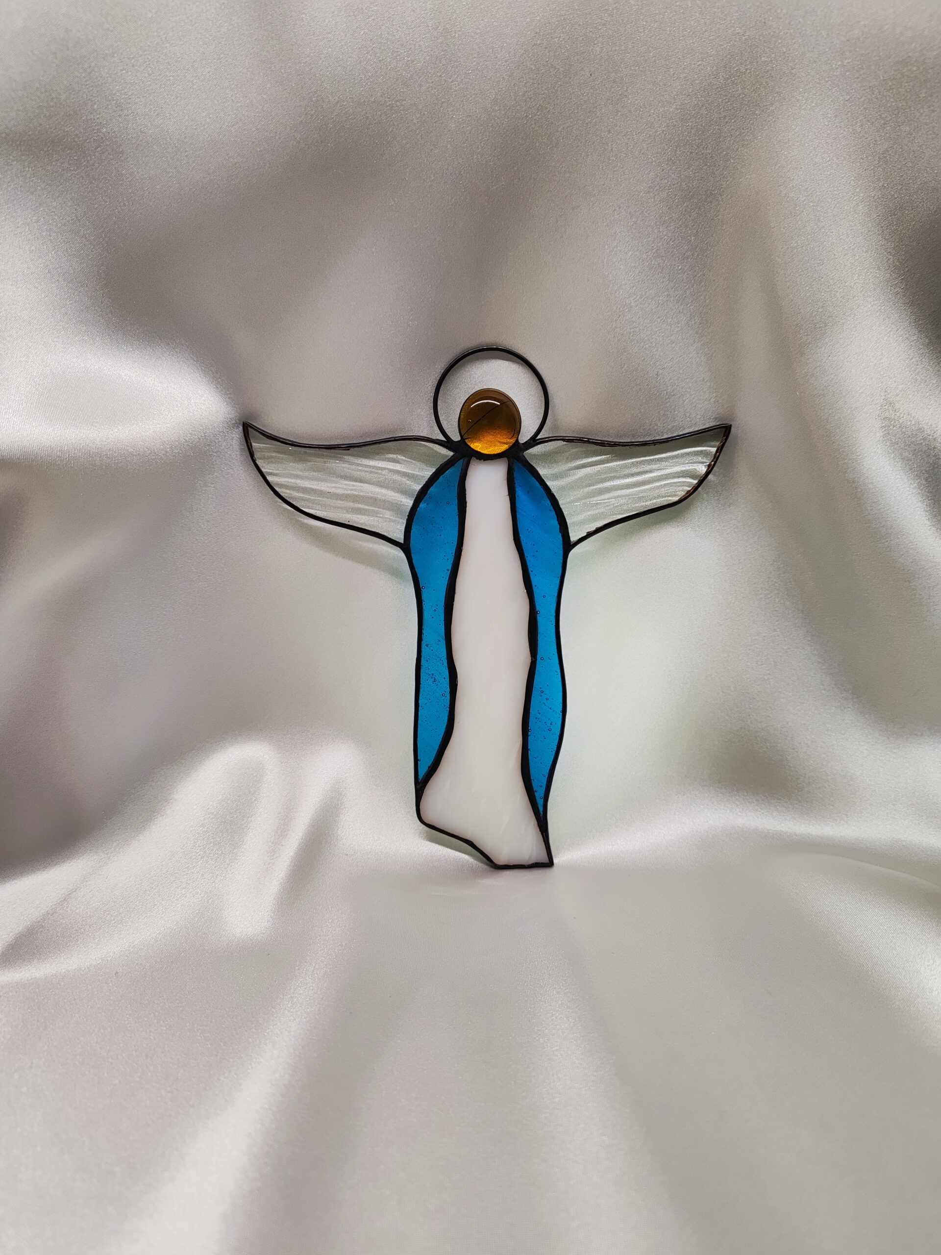 Ten minimalistyczny anioł witrażowy wykonany techniką Tiffany o wymiarach 16,5 cm na 15,5 cm, to dekoracja, która zachwyca prostotą formy i intensywnością barw. Smukła sylwetka, szeroko rozpostarte skrzydła i świetlista głowa z kaboszonu tworzą harmonijną, nowoczesną kompozycję idealną do świątecznych jak i całorocznych aranżacji. Każdy produkt wykonujemy na indywidualne zlecenie i dokładamy wszelkich starań aby był najwyższej jakości, dlatego też czas realizacji to około 21 dni. Po złożeniu zamówienia informujemy dokładnie o czasie realizacji.