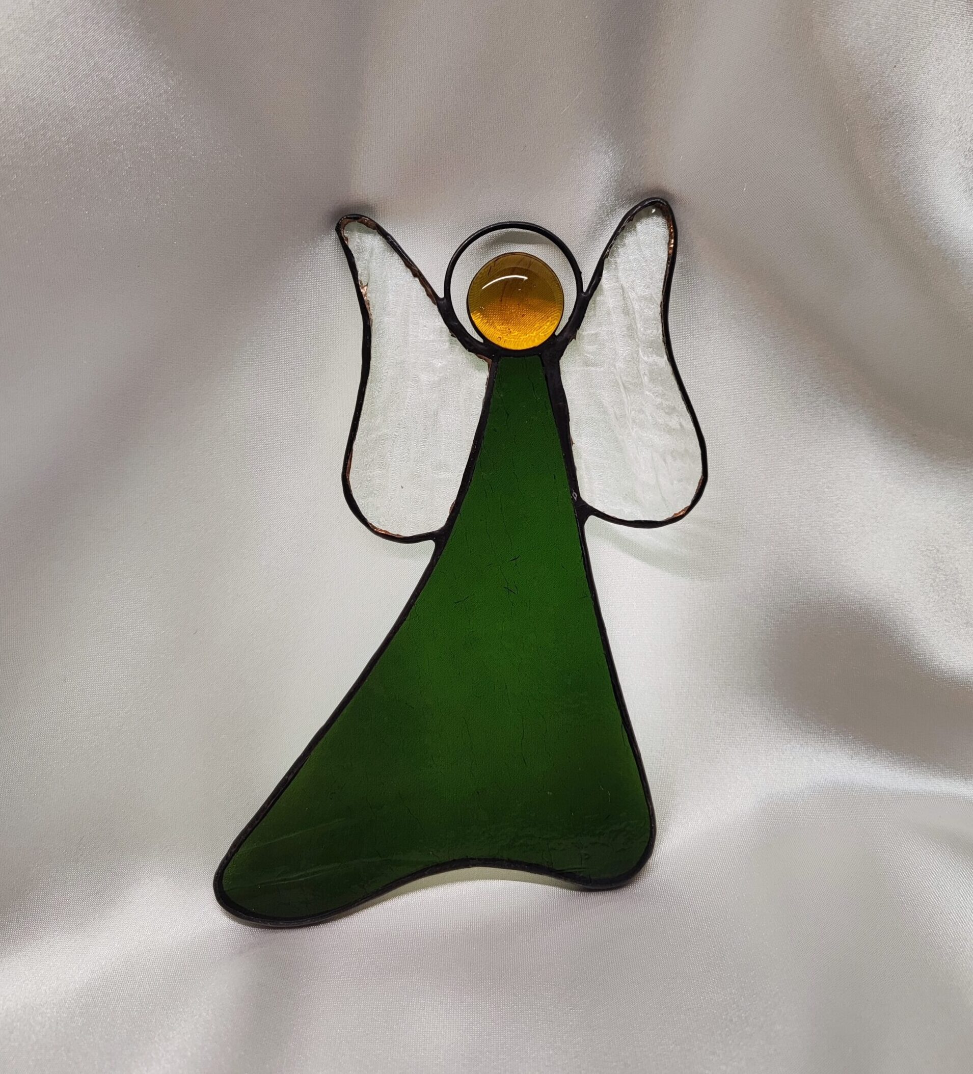 Ten subtelny anioł witrażowy wykonany w klasycznej technice Tiffany to idealna dekoracja dla osób ceniących minimalizm, elegancję i rękodzieło. Jego prosta, harmonijna forma oraz wyrazista kolorystyka sprawiają, że świetnie wpisuje się w aranżacje świąteczne. Centralnym elementem dekoracji jest głęboko zielona suknia, która także może być wykonana w innych kolorach, wykonana z jednolitego szkła witrażowego, które pięknie przepuszcza światło, tworząc nastrojowe refleksy. Dzięki niewielkiej wadze i prostej formie anioł doskonale nadaje się do zawieszenia w oknie, na choince, na ścianie lub jako uroczy dodatek do prezentu. Każdy produkt wykonujemy na indywidualne zlecenie i dokładamy wszelkich starań aby był najwyższej jakości, dlatego też czas realizacji to około 21 dni. Po złożeniu zamówienia informujemy dokładnie o czasie realizacji.