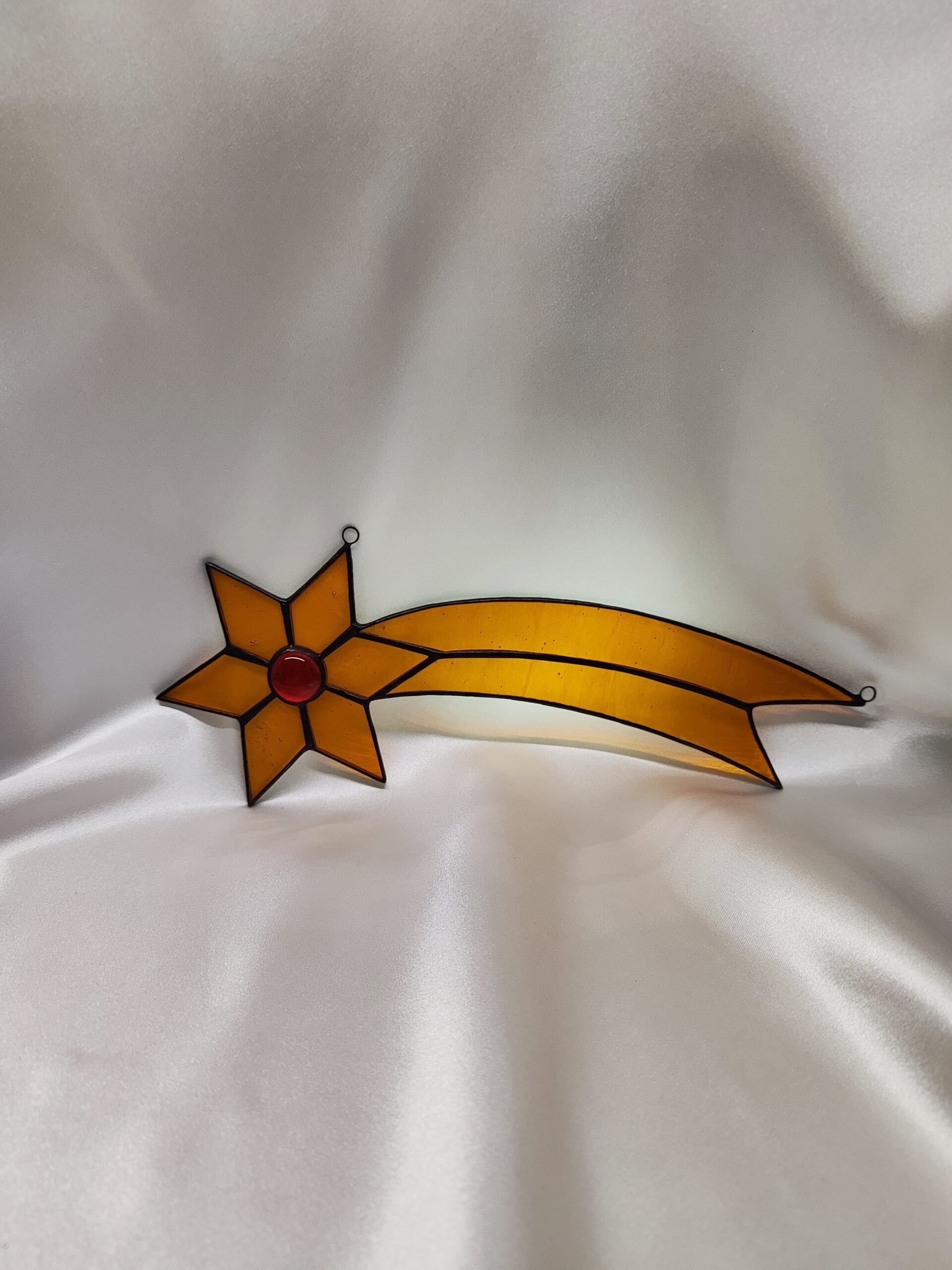 Witrażowa Gwiazda doda wyjątkowego klimatu świętom dzięki swojej wyjątkowości. Ozdoba została stworzona z barwionego szkła w odcieniach żółci i pomarańczu, a jej centrum zdobi czerwony kaboszon. Ma wymiary 25 cm na 8,5 cm. Ten wyjątkowy dodatek, który wniesie do wnętrza świąteczną atmosferę i subtelny, magiczny blask. Każdy produkt wykonujemy na indywidualne zlecenie i dokładamy wszelkich starań aby był najwyższej jakości, dlatego też czas realizacji to około 21 dni. Po złożeniu zamówienia informujemy dokładnie o czasie realizacji.